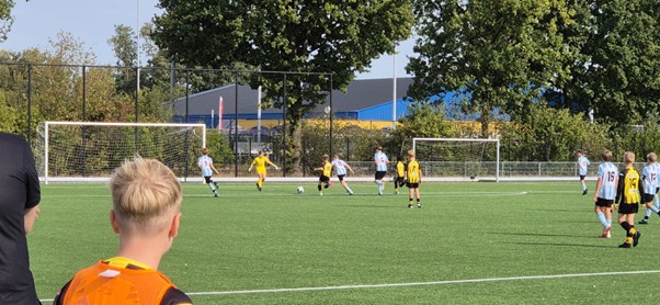 Voor het eerst dit seizoen mocht PH JO9-3 aantreden op echt gras. Alleen al de geur in de kleedkamer zorgde voor opwinding: dit voelde als een echte wedstrijd! Vlak voor de aftrap werd nog een laatste keeperswissel doorgevoerd en daarna kon het spektakel beginnen. De openingsfase verliep voorzichtig, maar al snel liet PH zien waar het toe in staat is. Uit een slimme intrap van Ties kwam Jazz vrij te staan en hij opende de score: 0-1. Kort daarna volgde een strakke uittrap van Luc, die Lucian in stelling bracht: 0-2. Een vloeiende aanval via Sam en Ties eindigde opnieuw bij Lucian: 0-3. Daarleveen kreeg tussendoor wel wat kansen, maar wist ze niet tussen de palen te krijgen. Een sterke verdedigende ingreep van Jazz hield bovendien een gevaarlijke aanval tegen. In het tweede deel begon PH iets afwachtender, maar al snel pakten de jongens de draad weer op. Na een vlot lopende aanval via Jakob en Ties kon Lewis de 0-4 binnen tikken. Daarleveen haalde nog een bal van de lijn, maar even later raakte Jakob de lat met een harde knal; Finn was alert en tikte de rebound binnen: 0-5. Daarna ging het snel. Met een reeks vlotte aanvallen en goed samenspel liep PH verder uit naar een ruime 0-9 voorsprong. Daarleveen probeerde sterker terug te komen en dwong Luc tot een goede redding, maar PH bleef domineren. Vanaf dat moment volgde een fase waarin de ene treffer de andere opvolgde. Het team bleef aandringen, probeerde ook eens van afstand en liet zien dat het aanvallend op allerlei manieren gevaarlijk kan zijn. Binnen korte tijd werd de voorsprong uitgebouwd tot 0-15, waarmee de wedstrijd feitelijk beslist was. Achterin bleven onder andere Sam en Lewis dicht op hun tegenstander waardoor de weinig kansen creëerden. Ook in het slotkwart gingen de doelpunten door. Daarleveen redde nog knap de eer, maar PH bepaalde uiteindelijk de eindstand op 1-21. Een indrukwekkend resultaat, maar het spelbeeld was eigenlijk minder mooi dan de uitslag doet vermoeden. Het combineren verliep vandaag niet zoals anders en door de grote voorsprong verdween de spanning uit de wedstrijd. En laten we eerlijk zijn: een spannende pot is eigenlijk veel leuker dan zo’n dikke uitslag
