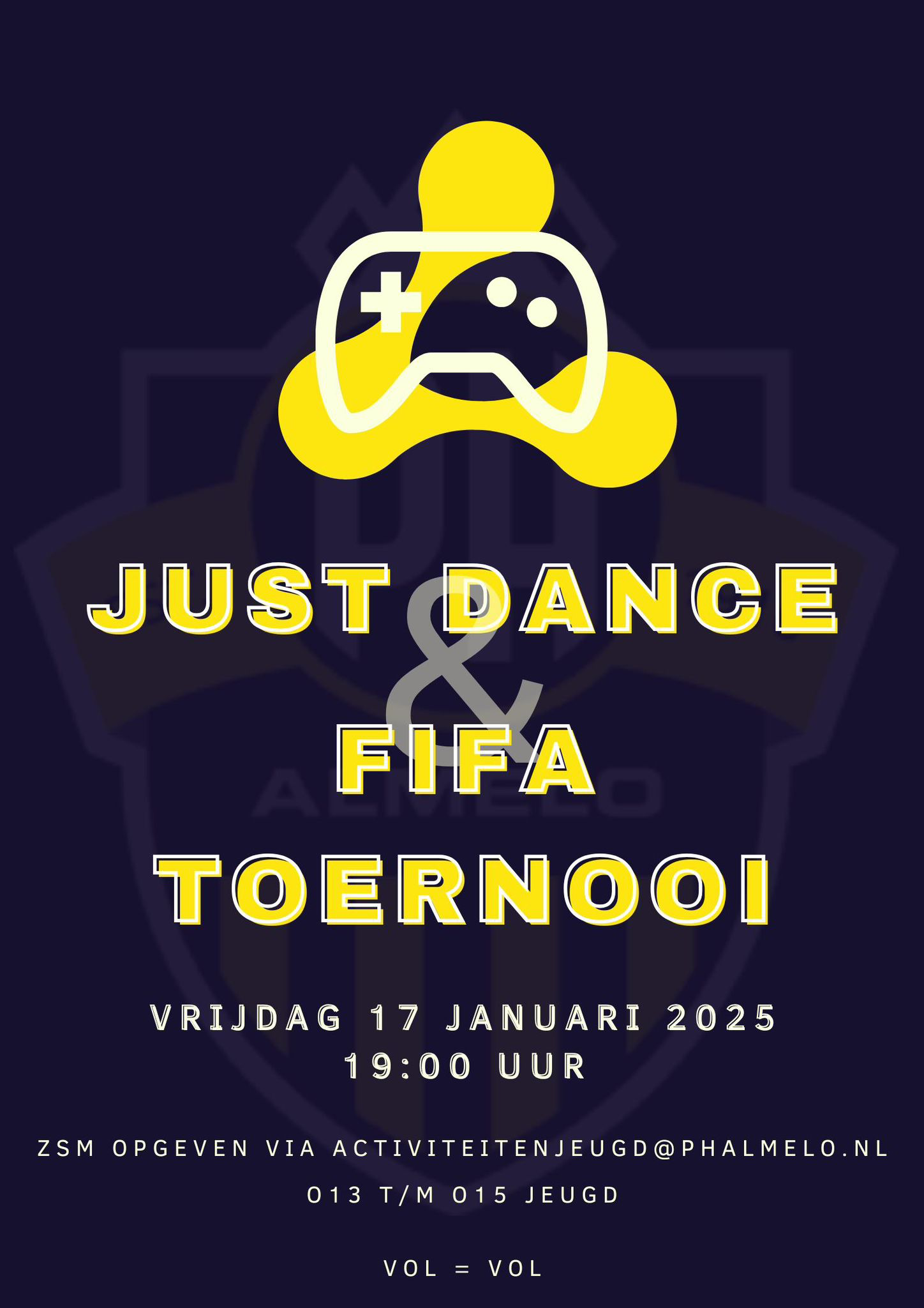 Voor alle spelers uit de O13- en O15-teams: het is tijd voor actie! Meld je aan voor het geweldige FIFA-toernooi (max. 40 deelnemers) of laat je beste dansmoves zien bij Just Dance (max. 16 deelnemers).